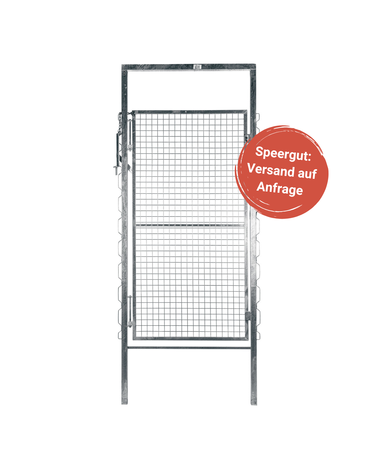 Das Tor ist aushängsicher konzipiert und mit einem Schließgalgen sowie einer Kette ausgestattet, was eine zuverlässige Selbstschließfunktion gewährleistet – ideal für den Einsatz in Bereichen mit regelmäßigem Durchgangsverkehr von Mensch oder Tier.
